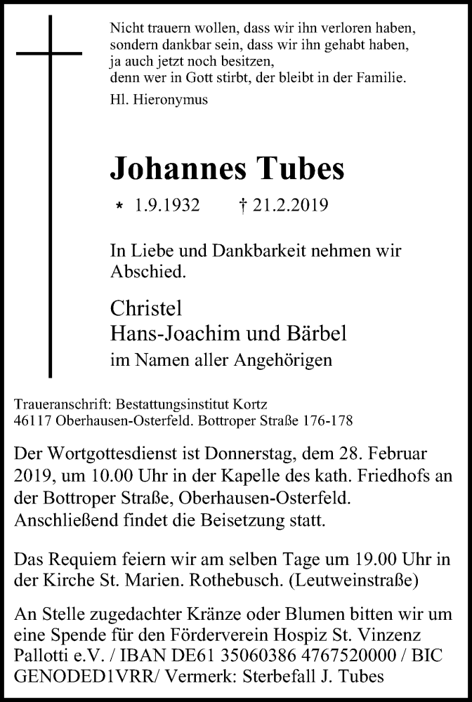 Hier finden Sie alle Traueranzeigen aus der Zeitung, die bisher für Johannes Tubes erschienen sind. Weitere Traueranzeigen, die in der Zeitung erscheinen, werden hier ebenfalls aufgelistet