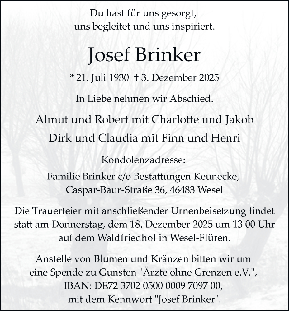 Hier finden Sie alle Traueranzeigen aus der Zeitung, die bisher für Josef Brinker erschienen sind. Weitere Traueranzeigen, die in der Zeitung erscheinen, werden hier ebenfalls aufgelistet