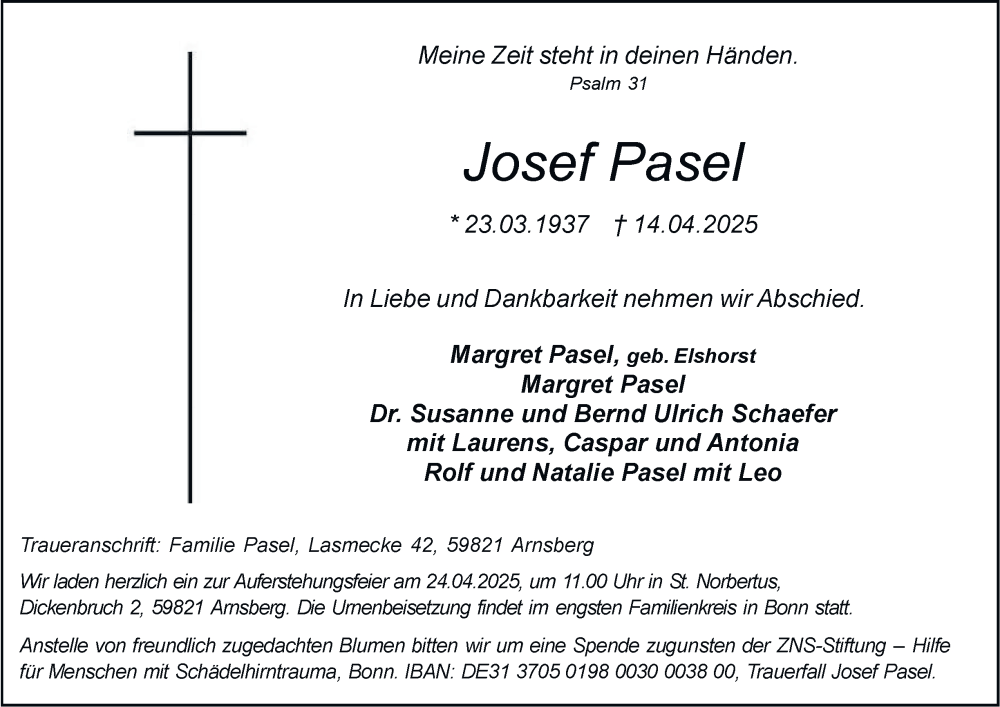 Hier finden Sie alle Traueranzeigen aus der Zeitung, die bisher für Josef Pasel erschienen sind. Weitere Traueranzeigen, die in der Zeitung erscheinen, werden hier ebenfalls aufgelistet