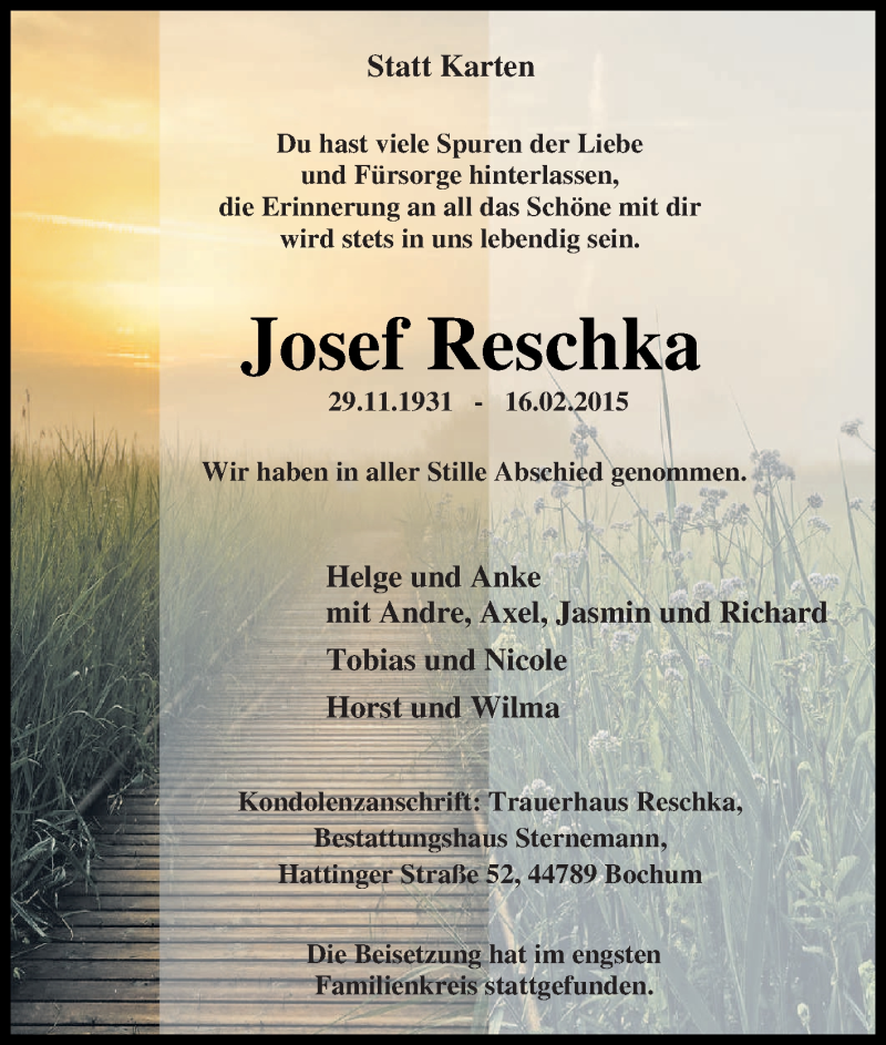 Hier finden Sie alle Traueranzeigen aus der Zeitung, die bisher für Josef Reschka erschienen sind. Weitere Traueranzeigen, die in der Zeitung erscheinen, werden hier ebenfalls aufgelistet