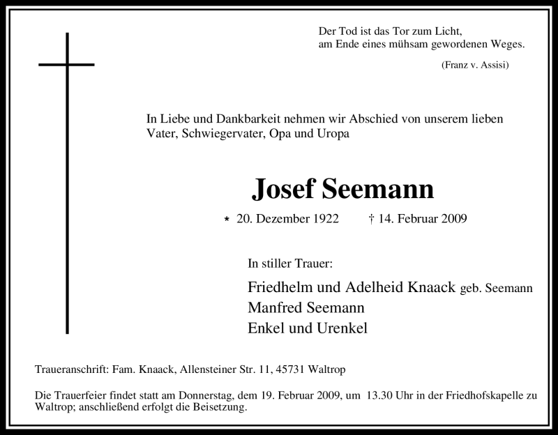 Hier finden Sie alle Traueranzeigen aus der Zeitung, die bisher für Josef Seemann erschienen sind. Weitere Traueranzeigen, die in der Zeitung erscheinen, werden hier ebenfalls aufgelistet