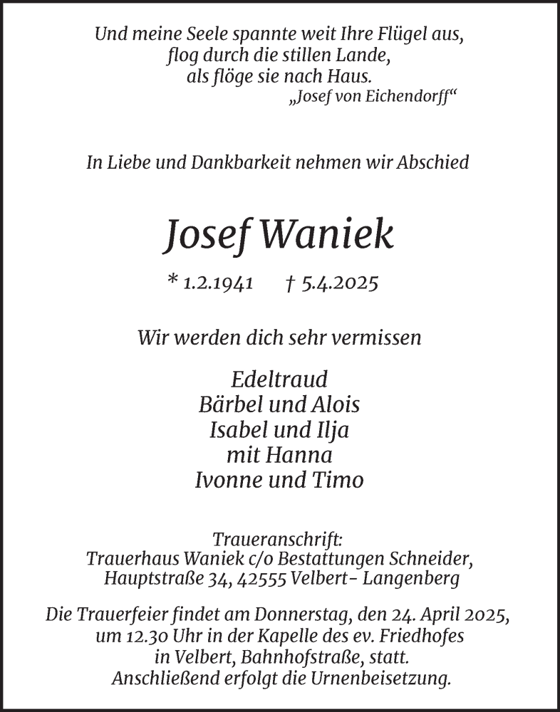 Hier finden Sie alle Traueranzeigen aus der Zeitung, die bisher für Josef Waniek erschienen sind. Weitere Traueranzeigen, die in der Zeitung erscheinen, werden hier ebenfalls aufgelistet