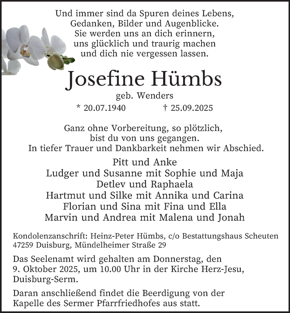 Hier finden Sie alle Traueranzeigen aus der Zeitung, die bisher für Josefine Hümbs erschienen sind. Weitere Traueranzeigen, die in der Zeitung erscheinen, werden hier ebenfalls aufgelistet