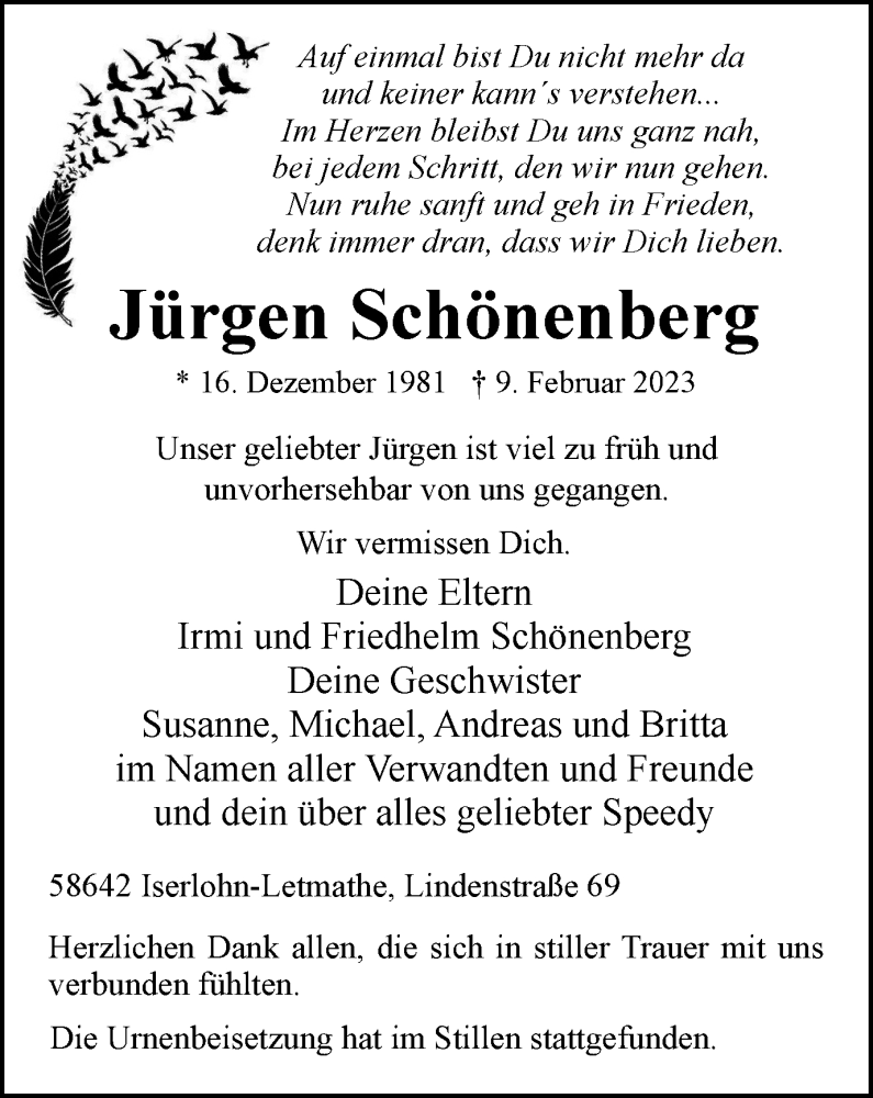 Hier finden Sie alle Traueranzeigen aus der Zeitung, die bisher für Jürgen Schönenberg erschienen sind. Weitere Traueranzeigen, die in der Zeitung erscheinen, werden hier ebenfalls aufgelistet