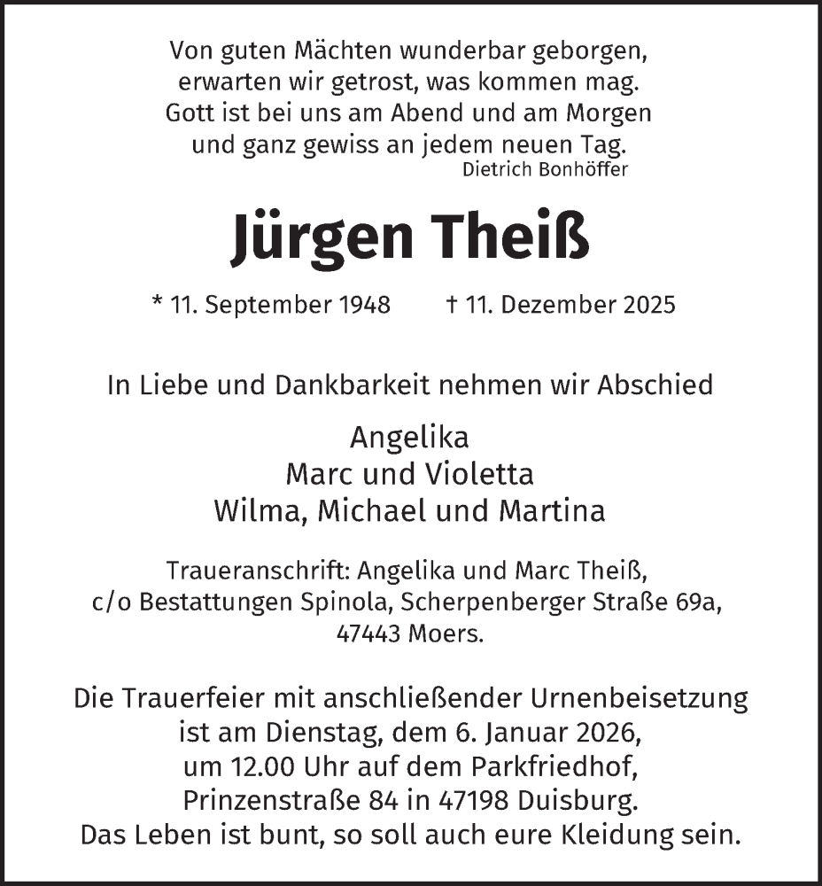 Hier finden Sie alle Traueranzeigen aus der Zeitung, die bisher für Jürgen Theiß erschienen sind. Weitere Traueranzeigen, die in der Zeitung erscheinen, werden hier ebenfalls aufgelistet