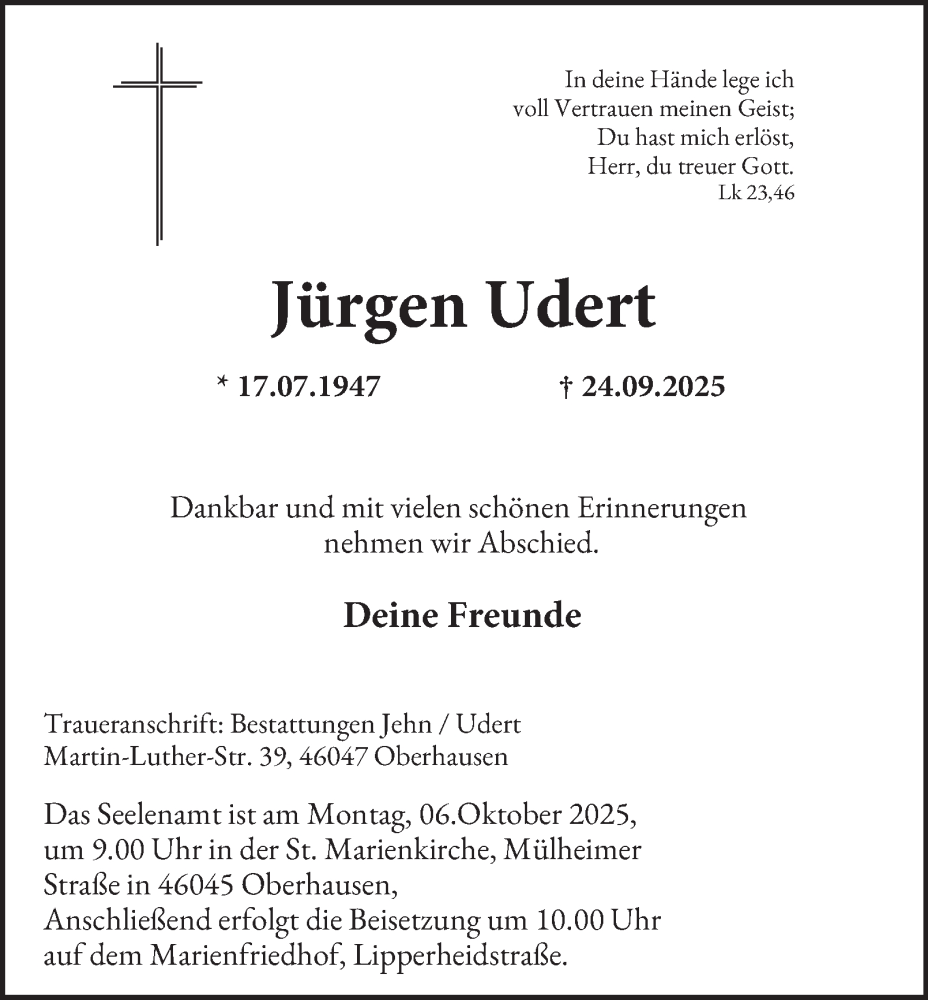 Hier finden Sie alle Traueranzeigen aus der Zeitung, die bisher für Jürgen Udert erschienen sind. Weitere Traueranzeigen, die in der Zeitung erscheinen, werden hier ebenfalls aufgelistet