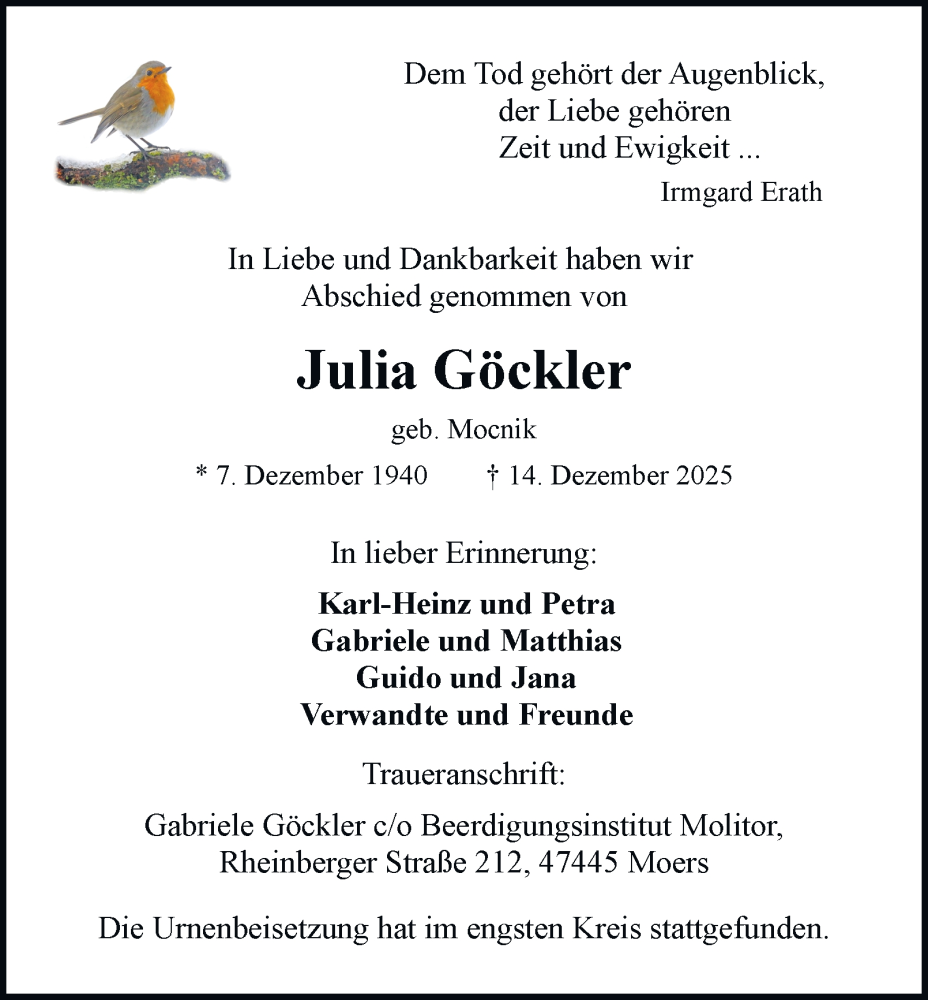 Hier finden Sie alle Traueranzeigen aus der Zeitung, die bisher für Julia Göckler erschienen sind. Weitere Traueranzeigen, die in der Zeitung erscheinen, werden hier ebenfalls aufgelistet