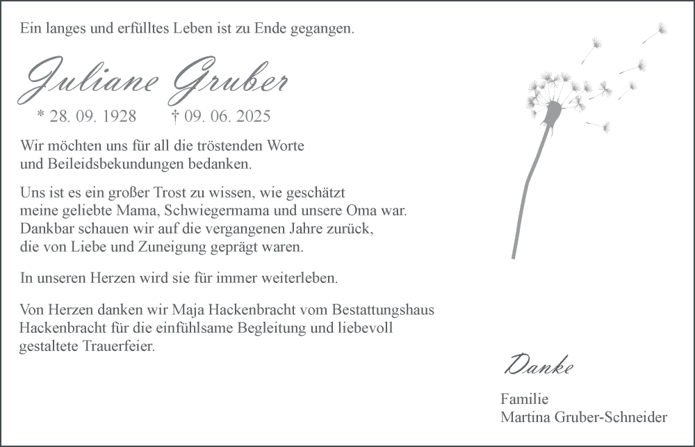 Hier finden Sie alle Traueranzeigen aus der Zeitung, die bisher für Juliane Gruber erschienen sind. Weitere Traueranzeigen, die in der Zeitung erscheinen, werden hier ebenfalls aufgelistet