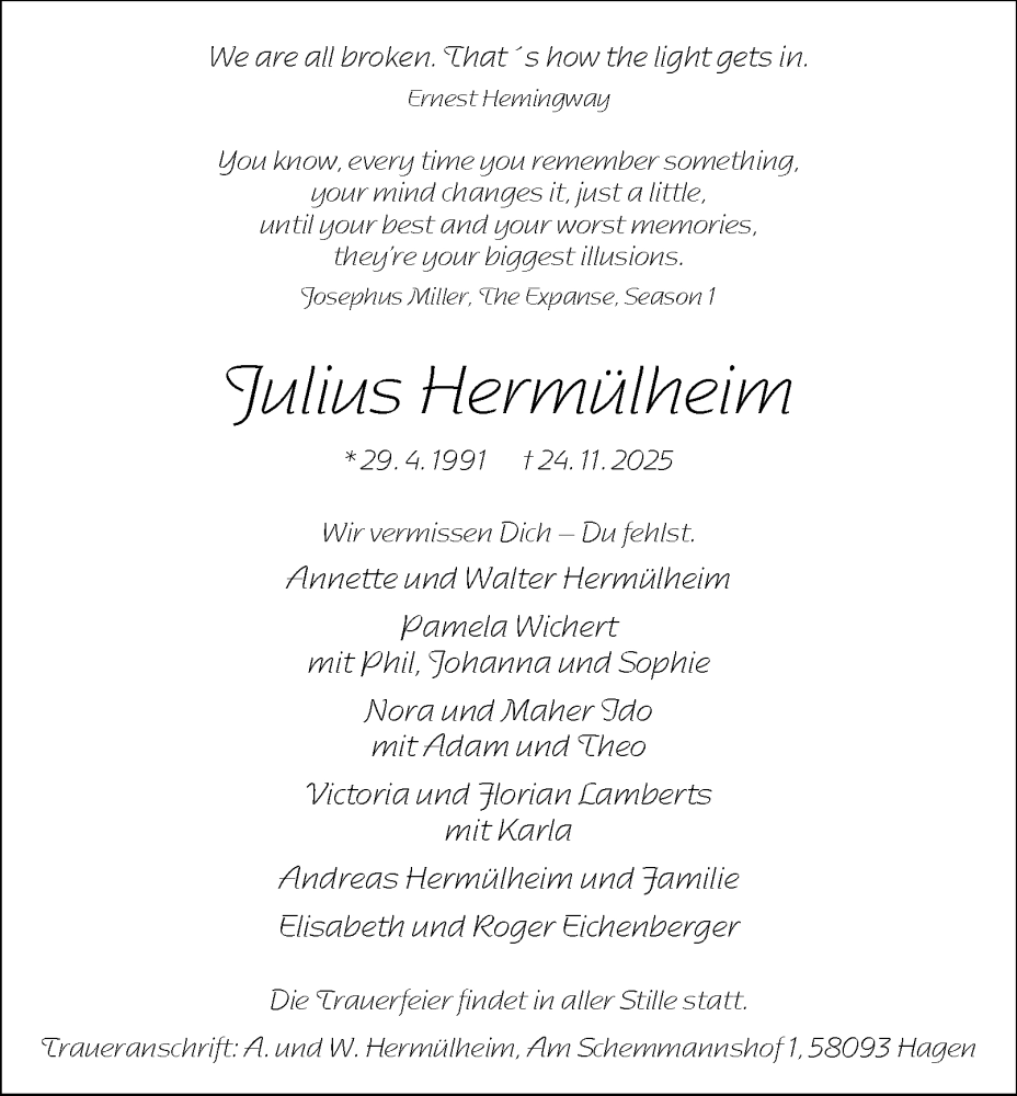Hier finden Sie alle Traueranzeigen aus der Zeitung, die bisher für Julius Hermülheim erschienen sind. Weitere Traueranzeigen, die in der Zeitung erscheinen, werden hier ebenfalls aufgelistet