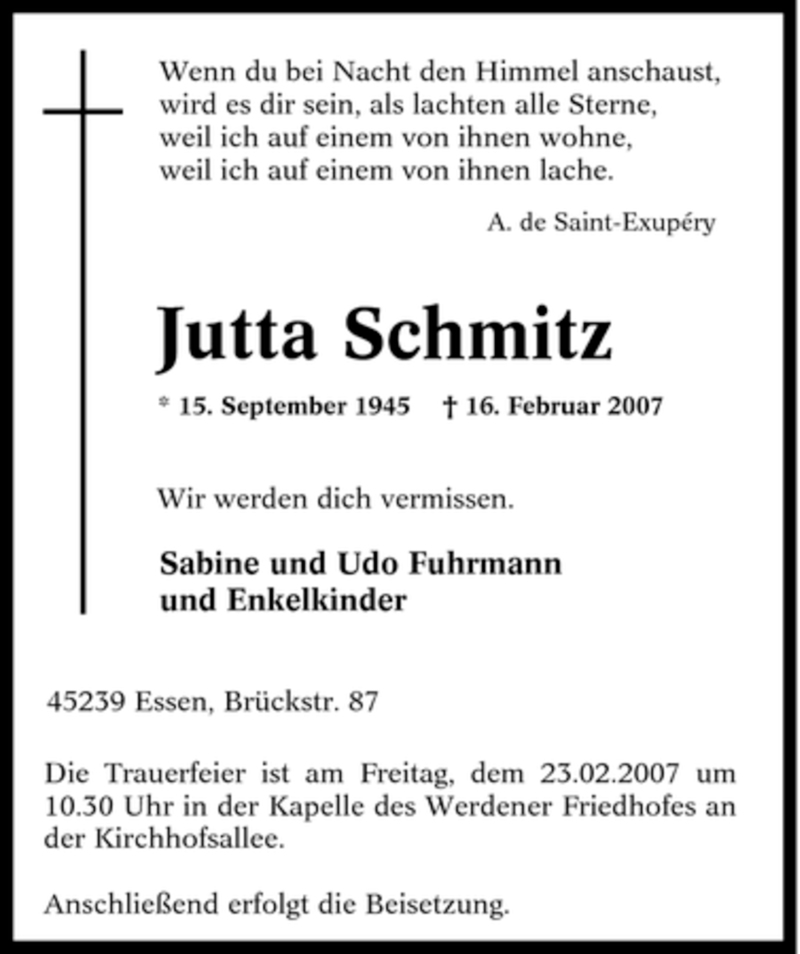 Hier finden Sie alle Traueranzeigen aus der Zeitung, die bisher für Jutta Schmitz erschienen sind. Weitere Traueranzeigen, die in der Zeitung erscheinen, werden hier ebenfalls aufgelistet