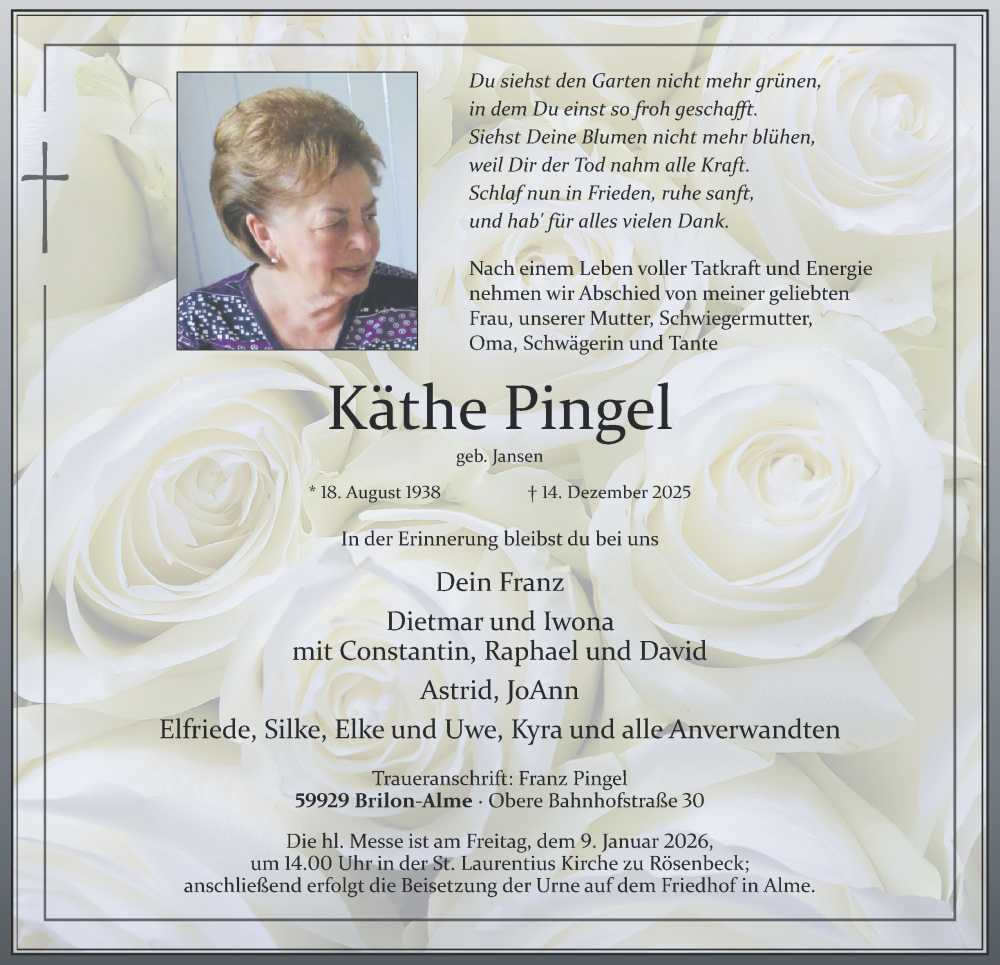 Hier finden Sie alle Traueranzeigen aus der Zeitung, die bisher für Käthe Pingel erschienen sind. Weitere Traueranzeigen, die in der Zeitung erscheinen, werden hier ebenfalls aufgelistet