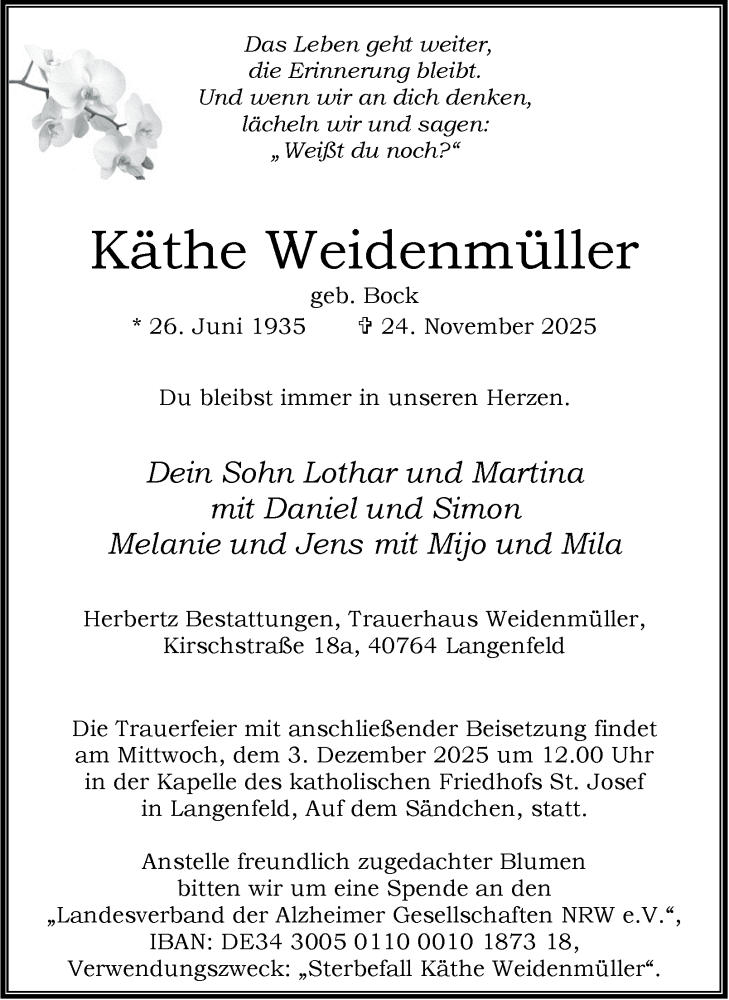 Hier finden Sie alle Traueranzeigen aus der Zeitung, die bisher für Käthe Weidenmüller erschienen sind. Weitere Traueranzeigen, die in der Zeitung erscheinen, werden hier ebenfalls aufgelistet