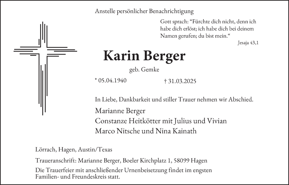 Hier finden Sie alle Traueranzeigen aus der Zeitung, die bisher für Karin Berger erschienen sind. Weitere Traueranzeigen, die in der Zeitung erscheinen, werden hier ebenfalls aufgelistet
