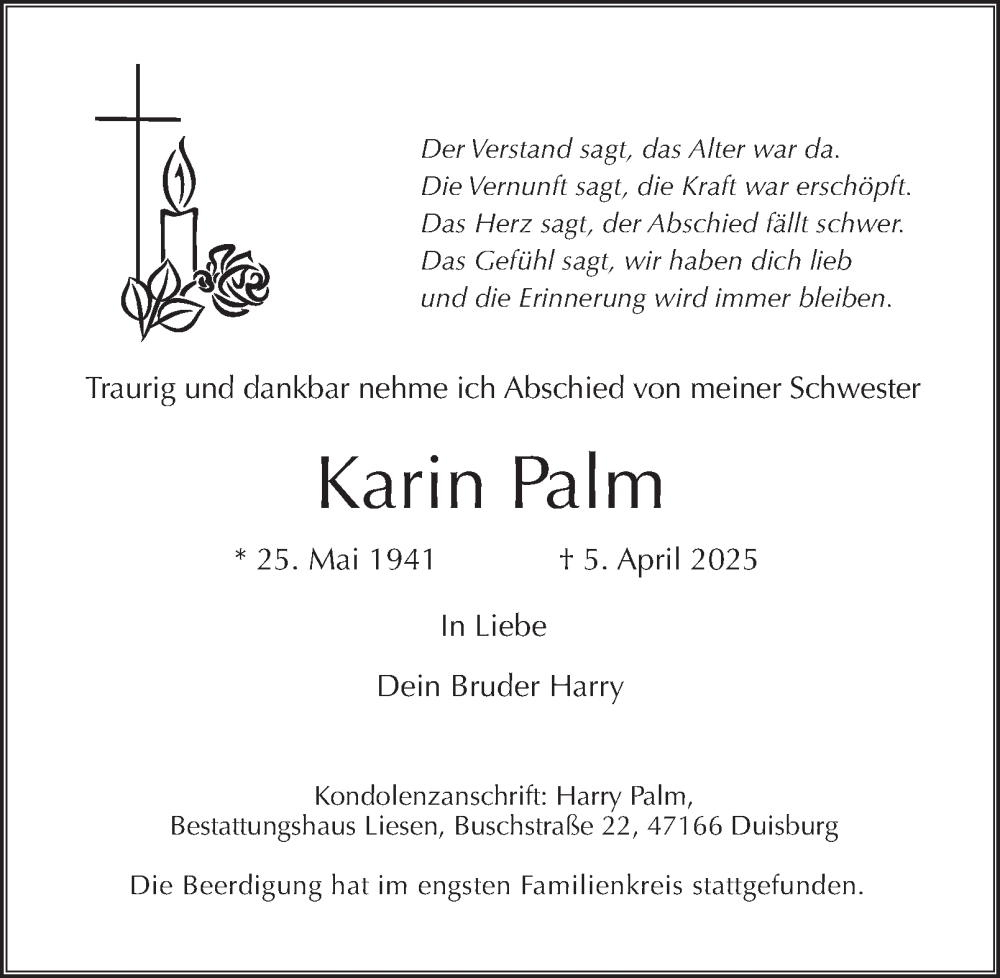 Hier finden Sie alle Traueranzeigen aus der Zeitung, die bisher für Karin Palm erschienen sind. Weitere Traueranzeigen, die in der Zeitung erscheinen, werden hier ebenfalls aufgelistet