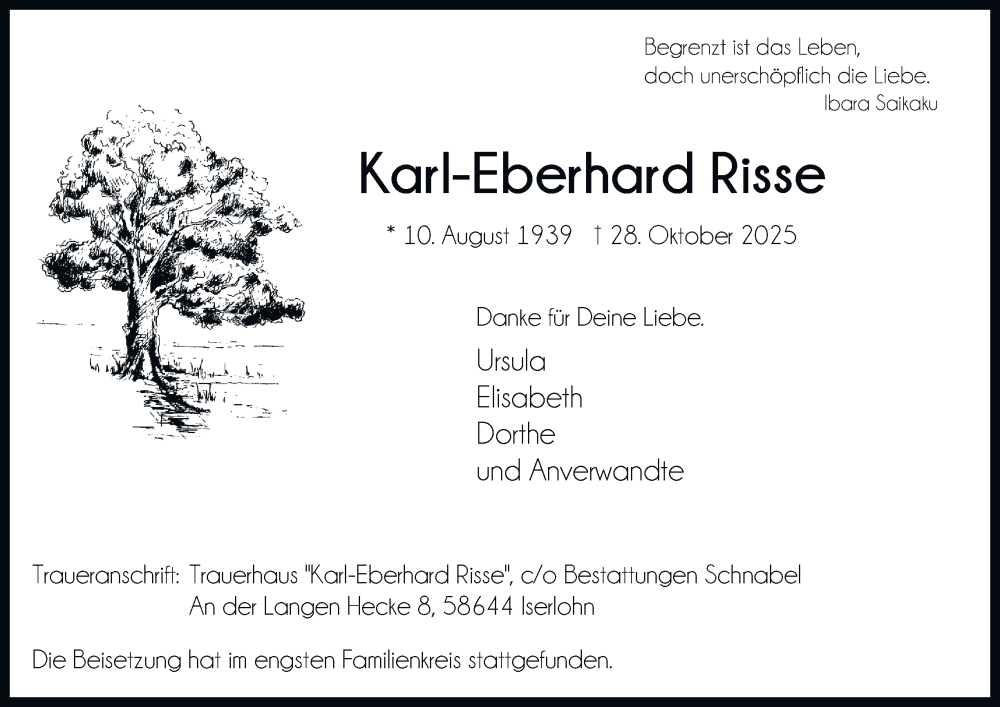 Hier finden Sie alle Traueranzeigen aus der Zeitung, die bisher für Karl-Eberhard Risse erschienen sind. Weitere Traueranzeigen, die in der Zeitung erscheinen, werden hier ebenfalls aufgelistet