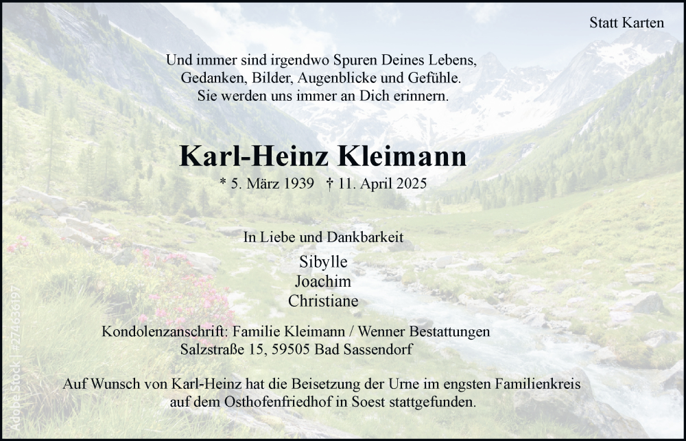 Hier finden Sie alle Traueranzeigen aus der Zeitung, die bisher für Karl-Heinz Kleimann erschienen sind. Weitere Traueranzeigen, die in der Zeitung erscheinen, werden hier ebenfalls aufgelistet