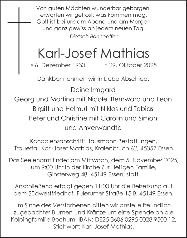 Hier finden Sie alle Traueranzeigen aus der Zeitung, die bisher für Karl-Josef Mathias erschienen sind. Weitere Traueranzeigen, die in der Zeitung erscheinen, werden hier ebenfalls aufgelistet