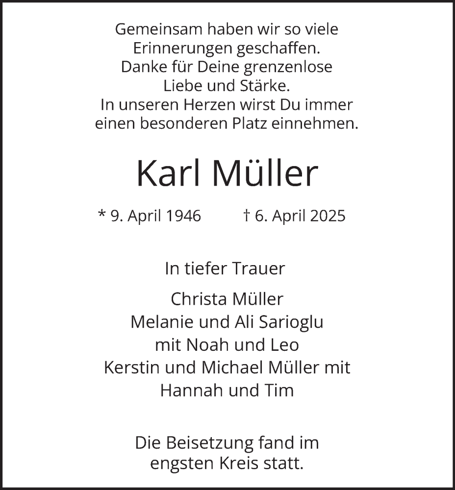 Hier finden Sie alle Traueranzeigen aus der Zeitung, die bisher für Karl Müller erschienen sind. Weitere Traueranzeigen, die in der Zeitung erscheinen, werden hier ebenfalls aufgelistet