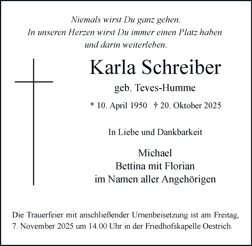 Hier finden Sie alle Traueranzeigen aus der Zeitung, die bisher für Karla Schreiber erschienen sind. Weitere Traueranzeigen, die in der Zeitung erscheinen, werden hier ebenfalls aufgelistet