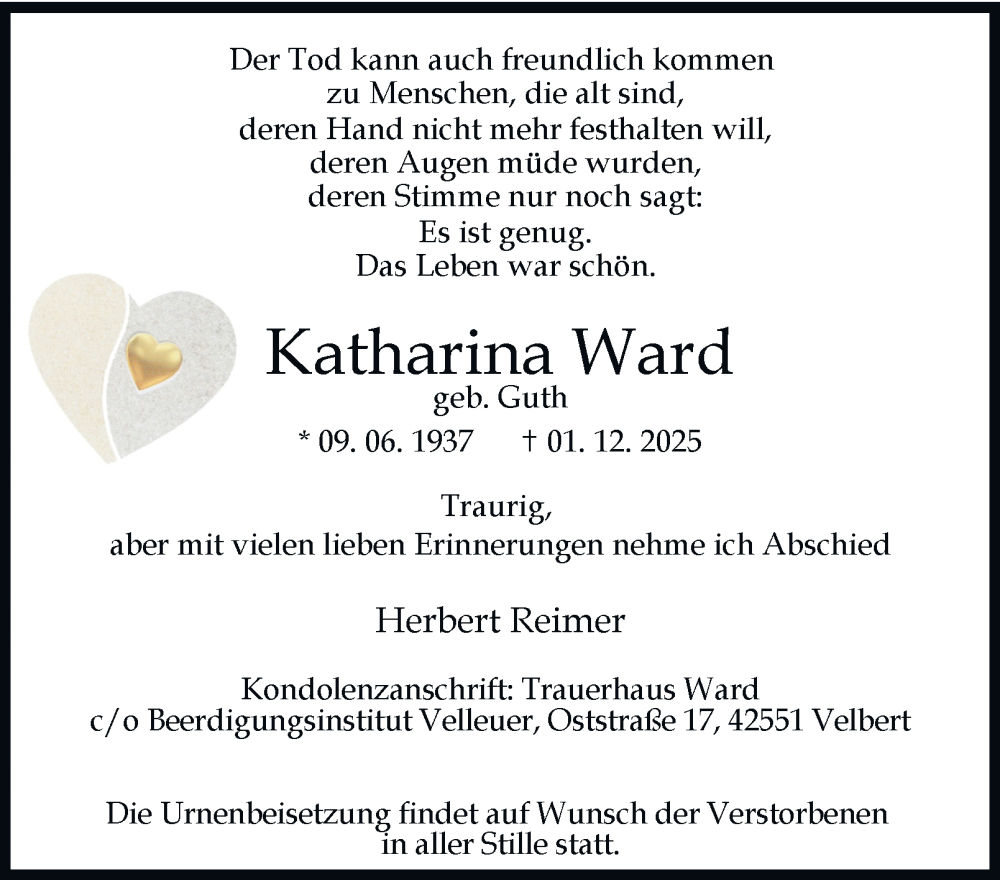 Hier finden Sie alle Traueranzeigen aus der Zeitung, die bisher für Katharina Ward erschienen sind. Weitere Traueranzeigen, die in der Zeitung erscheinen, werden hier ebenfalls aufgelistet
