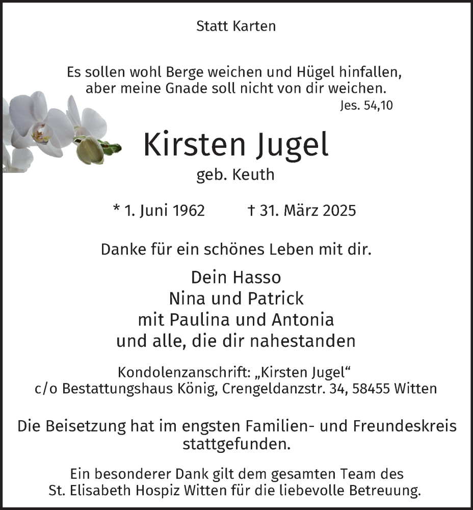 Hier finden Sie alle Traueranzeigen aus der Zeitung, die bisher für Kirsten Jugel erschienen sind. Weitere Traueranzeigen, die in der Zeitung erscheinen, werden hier ebenfalls aufgelistet