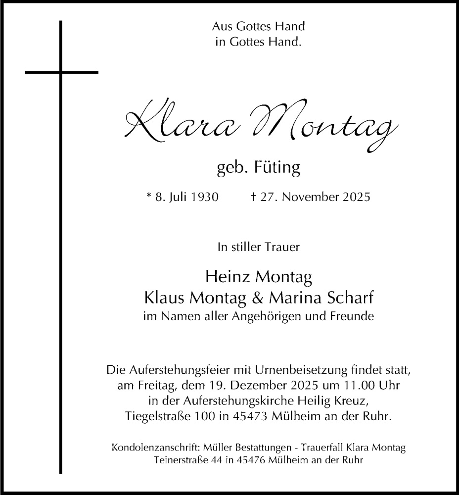 Hier finden Sie alle Traueranzeigen aus der Zeitung, die bisher für Klara Montag erschienen sind. Weitere Traueranzeigen, die in der Zeitung erscheinen, werden hier ebenfalls aufgelistet