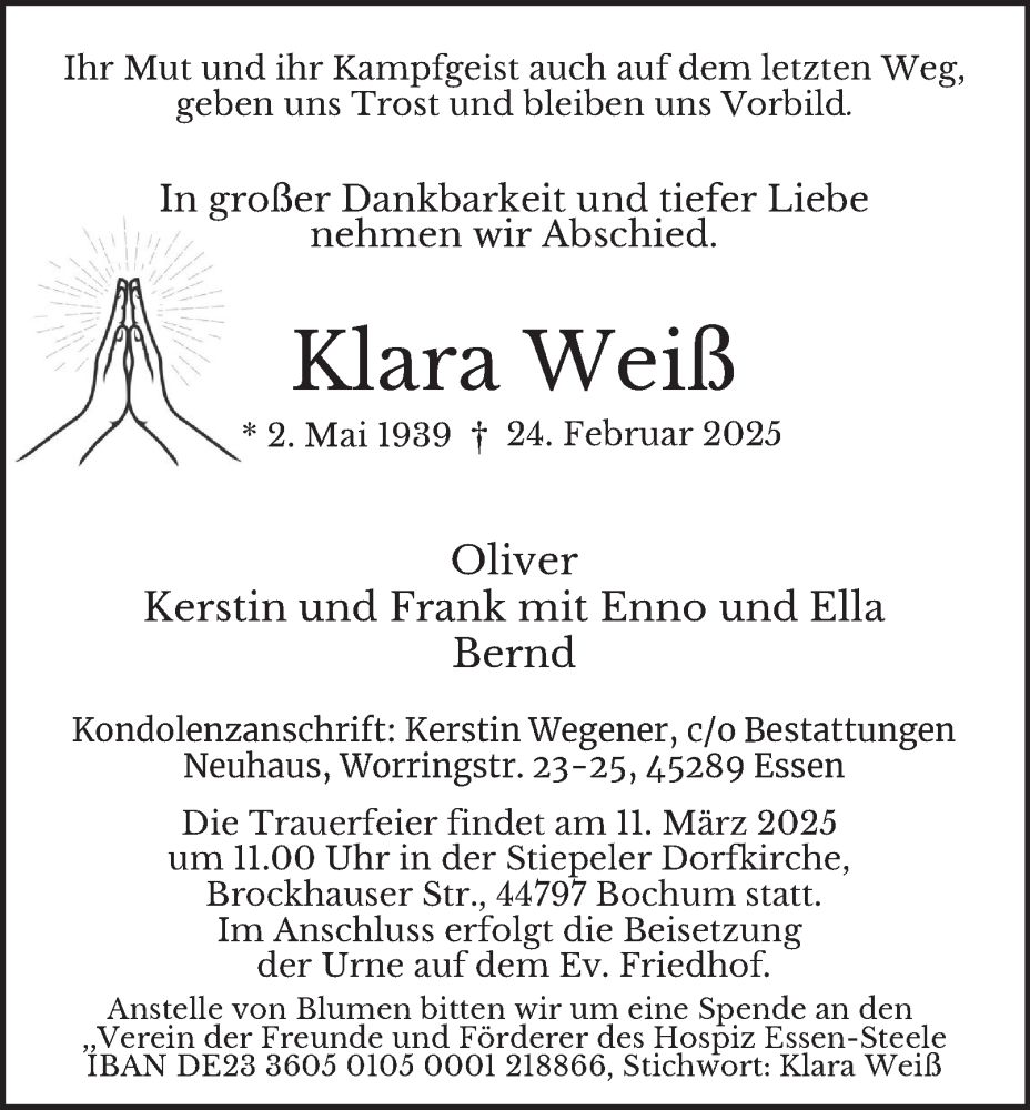 Hier finden Sie alle Traueranzeigen aus der Zeitung, die bisher für Klara Weiß erschienen sind. Weitere Traueranzeigen, die in der Zeitung erscheinen, werden hier ebenfalls aufgelistet