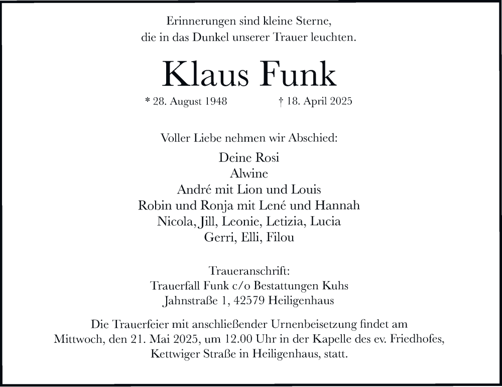 Hier finden Sie alle Traueranzeigen aus der Zeitung, die bisher für Klaus Funk erschienen sind. Weitere Traueranzeigen, die in der Zeitung erscheinen, werden hier ebenfalls aufgelistet