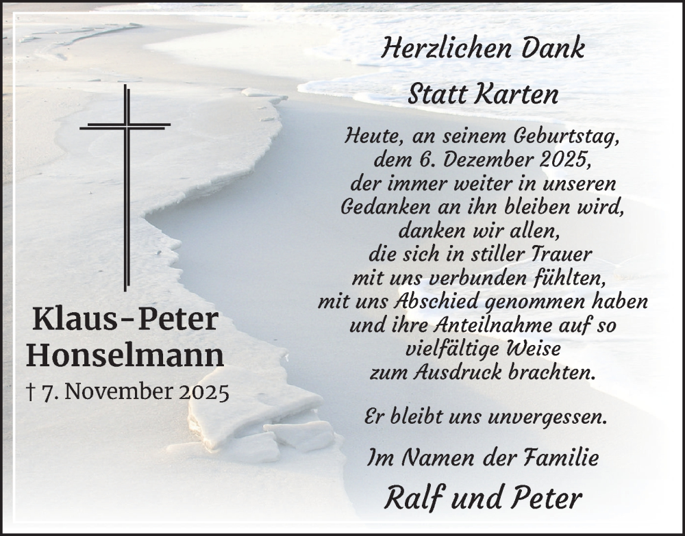 Hier finden Sie alle Traueranzeigen aus der Zeitung, die bisher für Klaus-Peter Honselmann erschienen sind. Weitere Traueranzeigen, die in der Zeitung erscheinen, werden hier ebenfalls aufgelistet