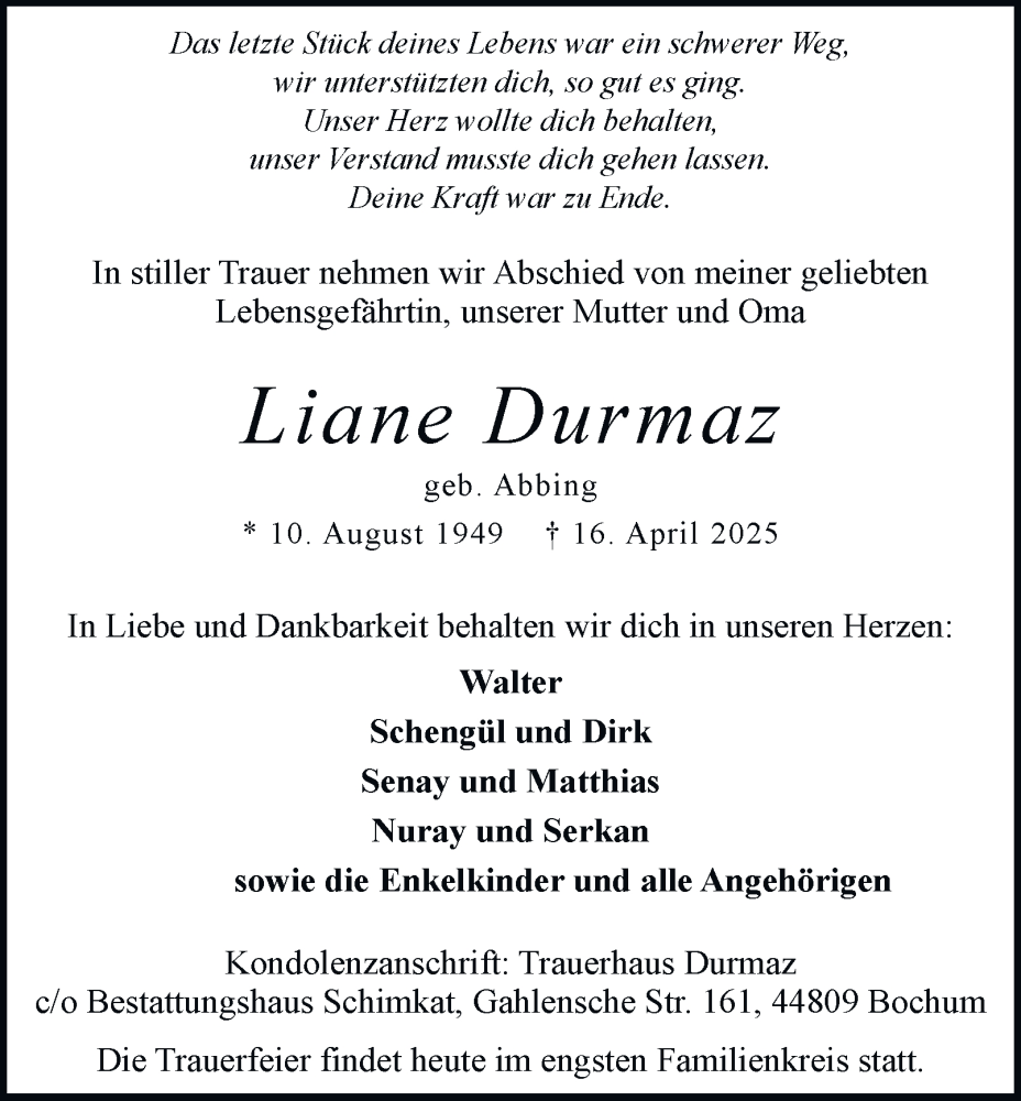 Hier finden Sie alle Traueranzeigen aus der Zeitung, die bisher für Liane Durmaz erschienen sind. Weitere Traueranzeigen, die in der Zeitung erscheinen, werden hier ebenfalls aufgelistet