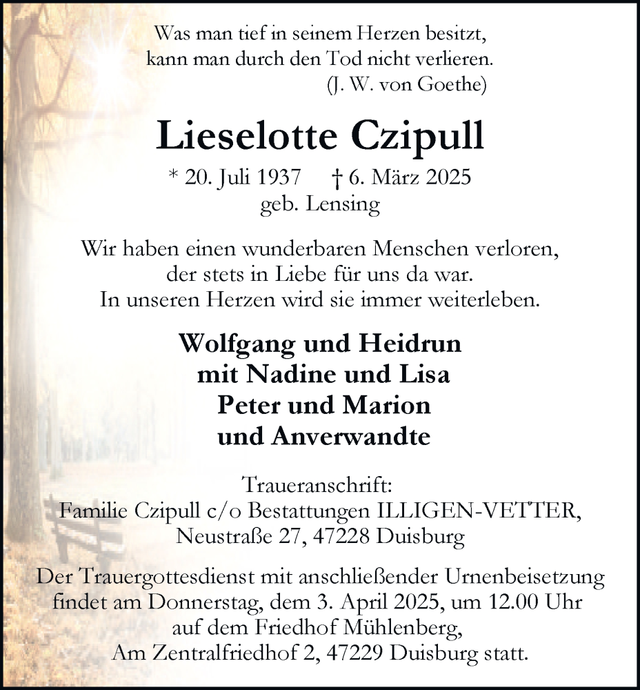 Hier finden Sie alle Traueranzeigen aus der Zeitung, die bisher für Lieselotte Czipull erschienen sind. Weitere Traueranzeigen, die in der Zeitung erscheinen, werden hier ebenfalls aufgelistet