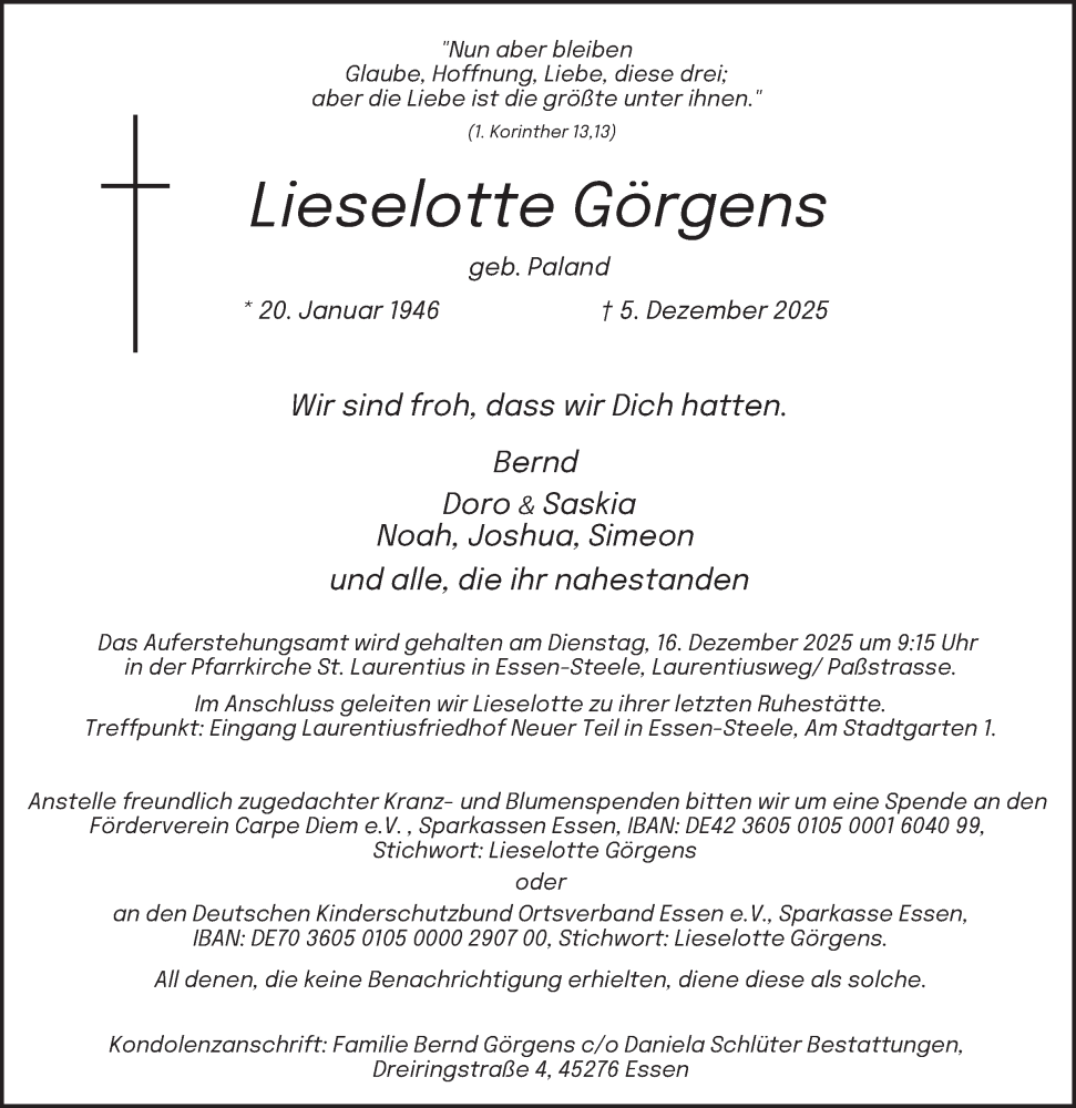 Hier finden Sie alle Traueranzeigen aus der Zeitung, die bisher für Lieselotte Görgens erschienen sind. Weitere Traueranzeigen, die in der Zeitung erscheinen, werden hier ebenfalls aufgelistet