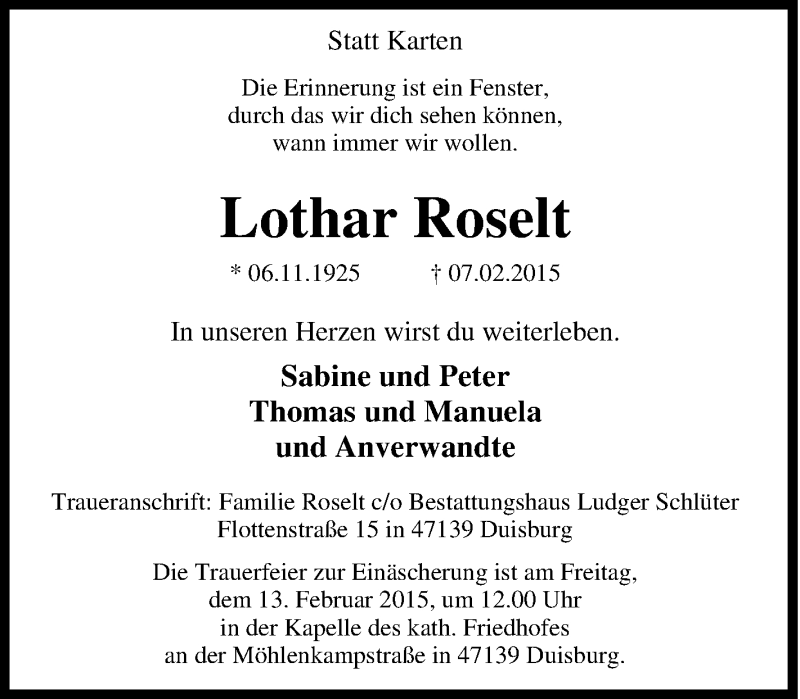 Hier finden Sie alle Traueranzeigen aus der Zeitung, die bisher für Lothar Roselt erschienen sind. Weitere Traueranzeigen, die in der Zeitung erscheinen, werden hier ebenfalls aufgelistet