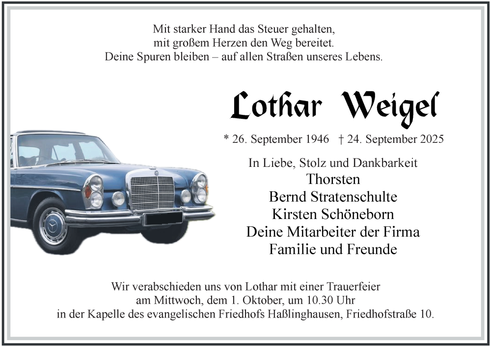 Hier finden Sie alle Traueranzeigen aus der Zeitung, die bisher für Lothar Weigel erschienen sind. Weitere Traueranzeigen, die in der Zeitung erscheinen, werden hier ebenfalls aufgelistet