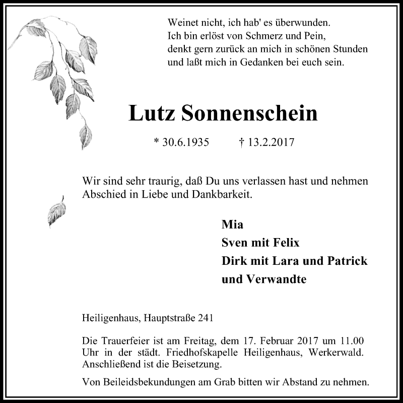 Hier finden Sie alle Traueranzeigen aus der Zeitung, die bisher für Lutz Sonnenschein erschienen sind. Weitere Traueranzeigen, die in der Zeitung erscheinen, werden hier ebenfalls aufgelistet