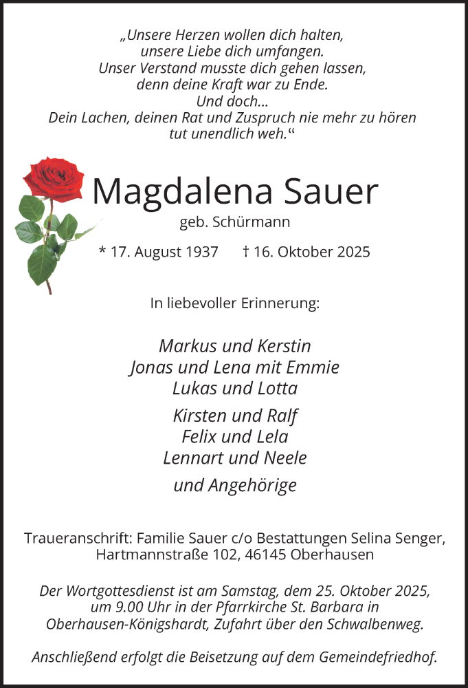 Hier finden Sie alle Traueranzeigen aus der Zeitung, die bisher für Magdalena Sauer erschienen sind. Weitere Traueranzeigen, die in der Zeitung erscheinen, werden hier ebenfalls aufgelistet