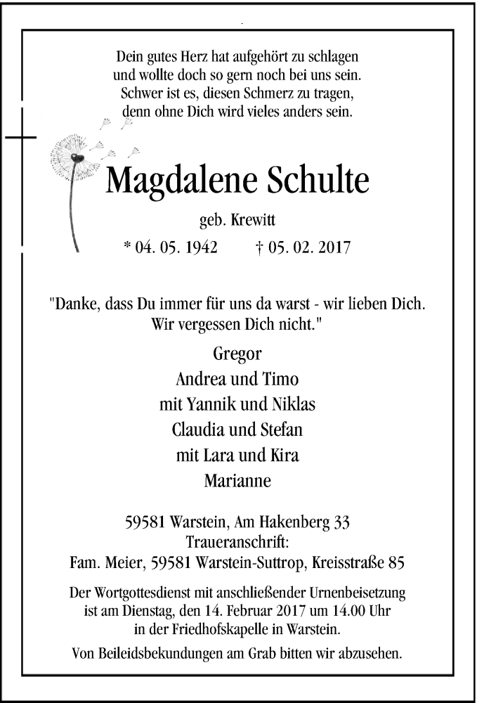 Hier finden Sie alle Traueranzeigen aus der Zeitung, die bisher für Magdalene Schulte erschienen sind. Weitere Traueranzeigen, die in der Zeitung erscheinen, werden hier ebenfalls aufgelistet