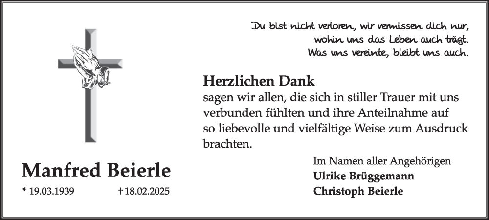 Hier finden Sie alle Traueranzeigen aus der Zeitung, die bisher für Manfred Beierle erschienen sind. Weitere Traueranzeigen, die in der Zeitung erscheinen, werden hier ebenfalls aufgelistet