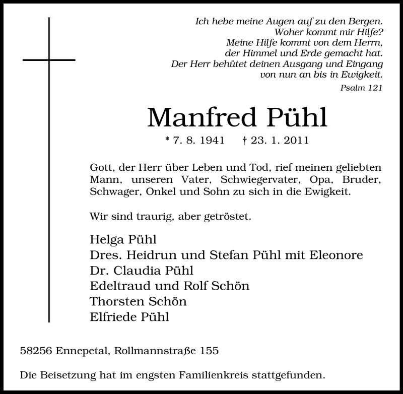 Hier finden Sie alle Traueranzeigen aus der Zeitung, die bisher für Manfred Pühl erschienen sind. Weitere Traueranzeigen, die in der Zeitung erscheinen, werden hier ebenfalls aufgelistet
