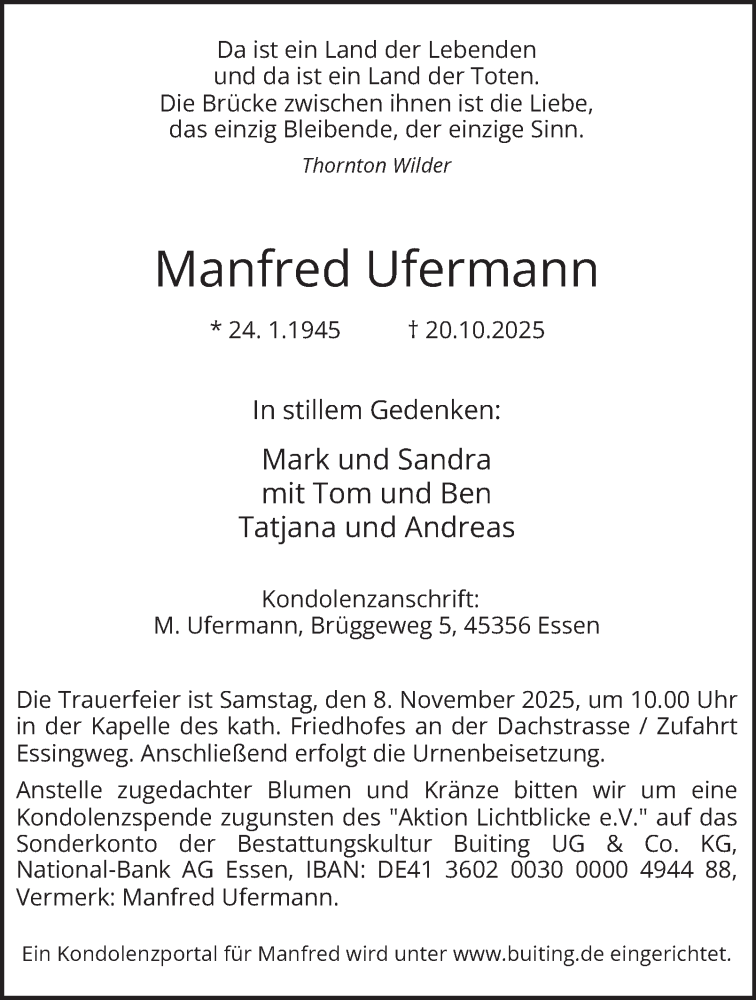 Hier finden Sie alle Traueranzeigen aus der Zeitung, die bisher für Manfred Ufermann erschienen sind. Weitere Traueranzeigen, die in der Zeitung erscheinen, werden hier ebenfalls aufgelistet