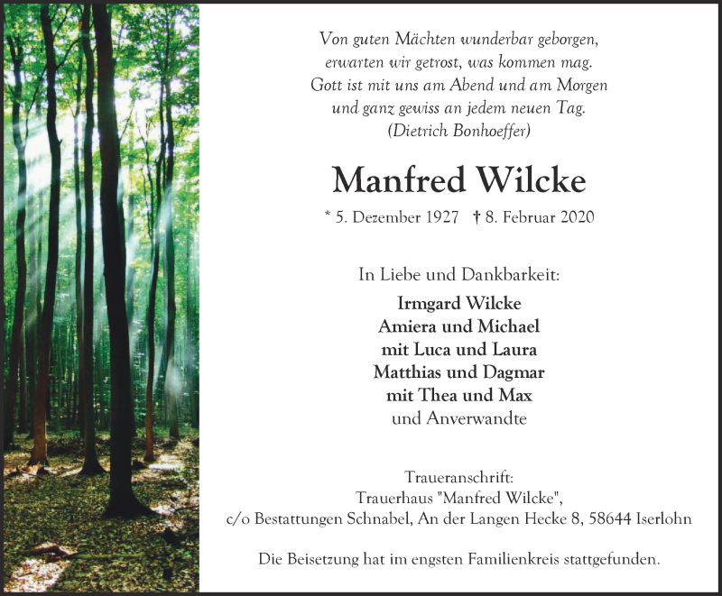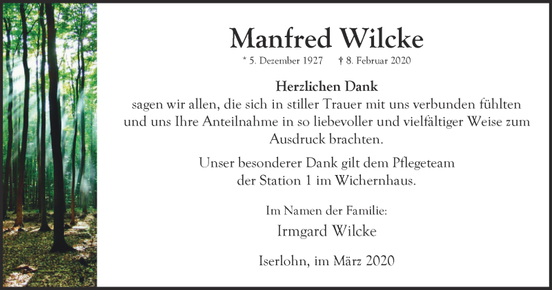 Hier finden Sie alle Traueranzeigen aus der Zeitung, die bisher für Manfred Wilcke erschienen sind. Weitere Traueranzeigen, die in der Zeitung erscheinen, werden hier ebenfalls aufgelistet