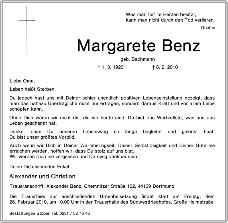 Hier finden Sie alle Traueranzeigen aus der Zeitung, die bisher für Margarete Benz erschienen sind. Weitere Traueranzeigen, die in der Zeitung erscheinen, werden hier ebenfalls aufgelistet
