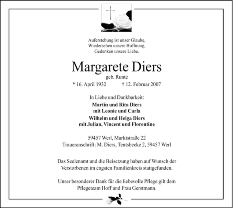 Hier finden Sie alle Traueranzeigen aus der Zeitung, die bisher für Margarete Diers erschienen sind. Weitere Traueranzeigen, die in der Zeitung erscheinen, werden hier ebenfalls aufgelistet
