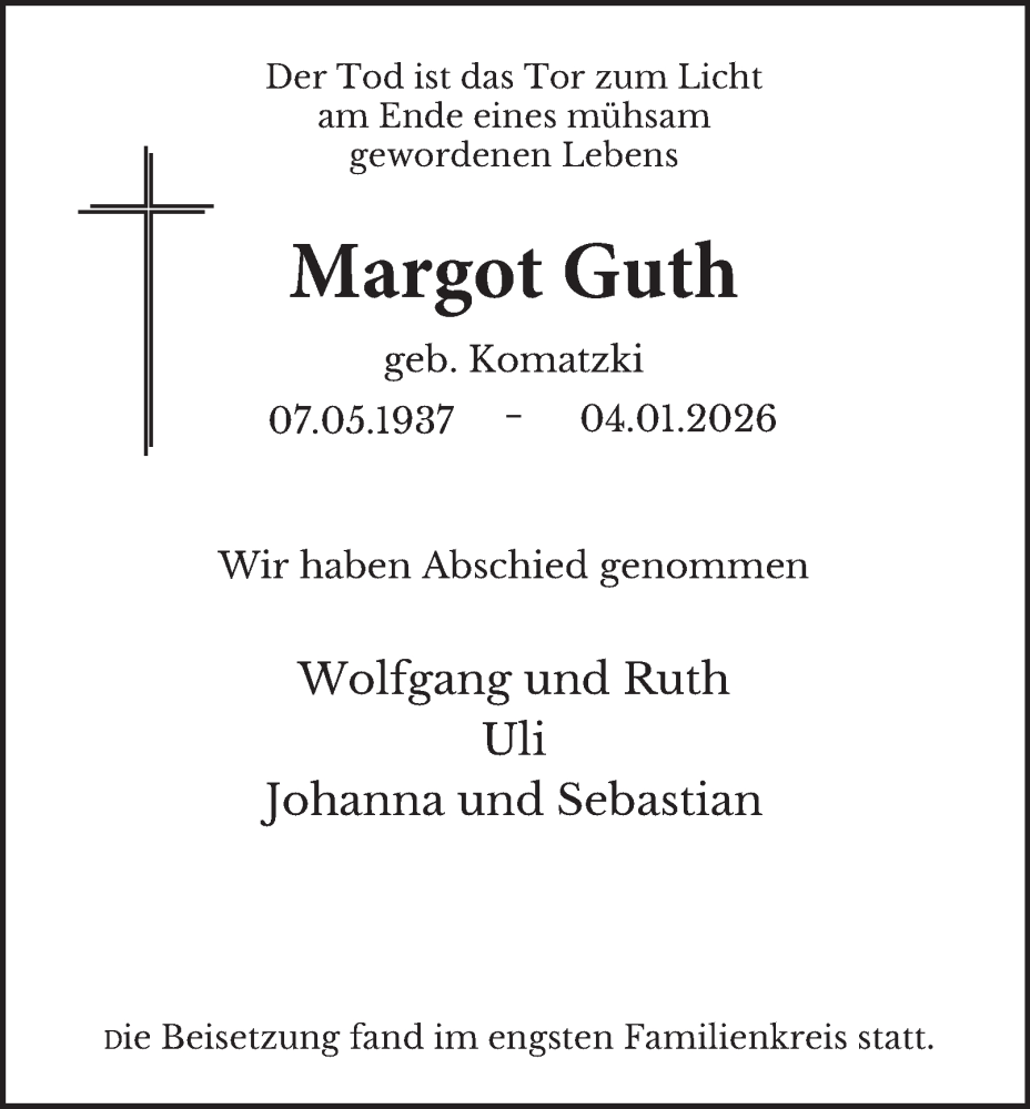 Hier finden Sie alle Traueranzeigen aus der Zeitung, die bisher für Margot Guth erschienen sind. Weitere Traueranzeigen, die in der Zeitung erscheinen, werden hier ebenfalls aufgelistet
