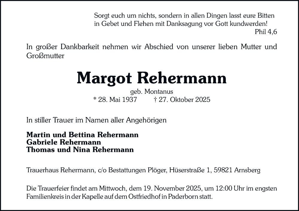 Hier finden Sie alle Traueranzeigen aus der Zeitung, die bisher für Margot Rehermann erschienen sind. Weitere Traueranzeigen, die in der Zeitung erscheinen, werden hier ebenfalls aufgelistet