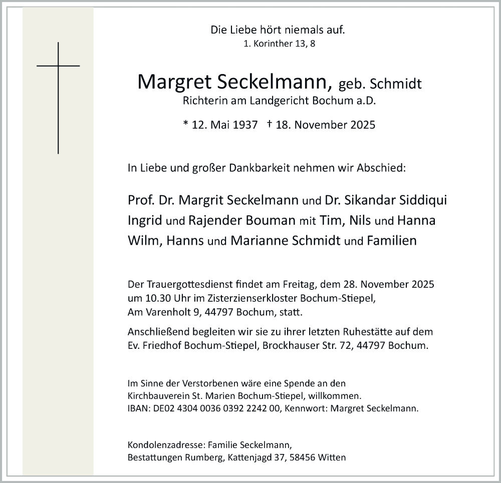 Hier finden Sie alle Traueranzeigen aus der Zeitung, die bisher für Margret Seckelmann erschienen sind. Weitere Traueranzeigen, die in der Zeitung erscheinen, werden hier ebenfalls aufgelistet