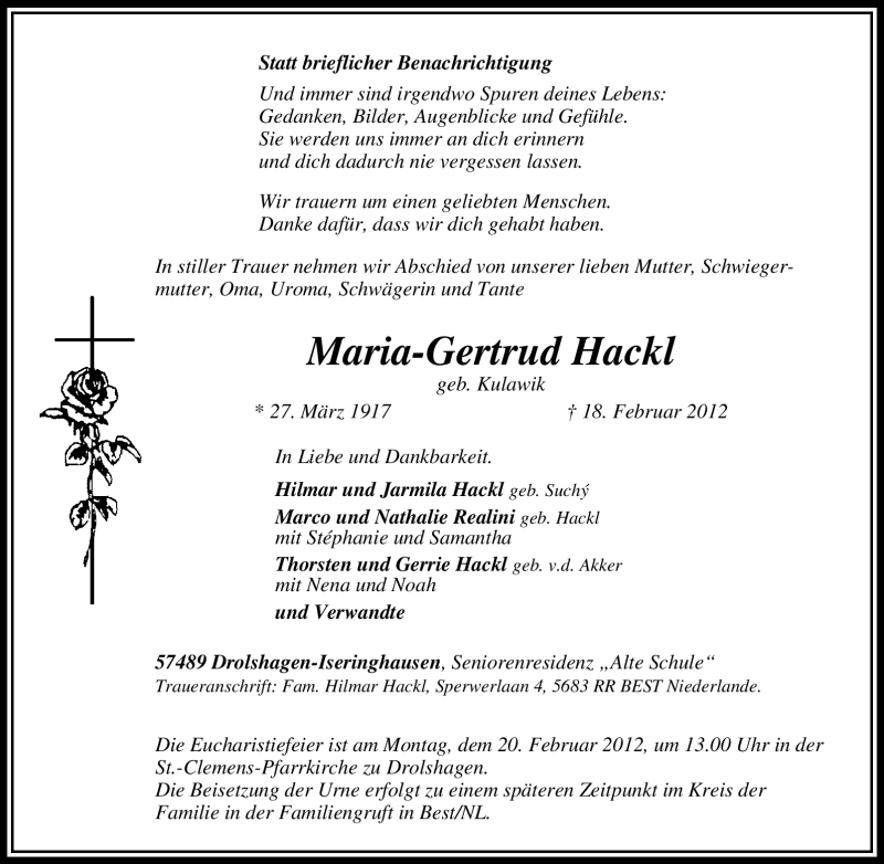 Hier finden Sie alle Traueranzeigen aus der Zeitung, die bisher für Maria-Gertrud Hackl erschienen sind. Weitere Traueranzeigen, die in der Zeitung erscheinen, werden hier ebenfalls aufgelistet