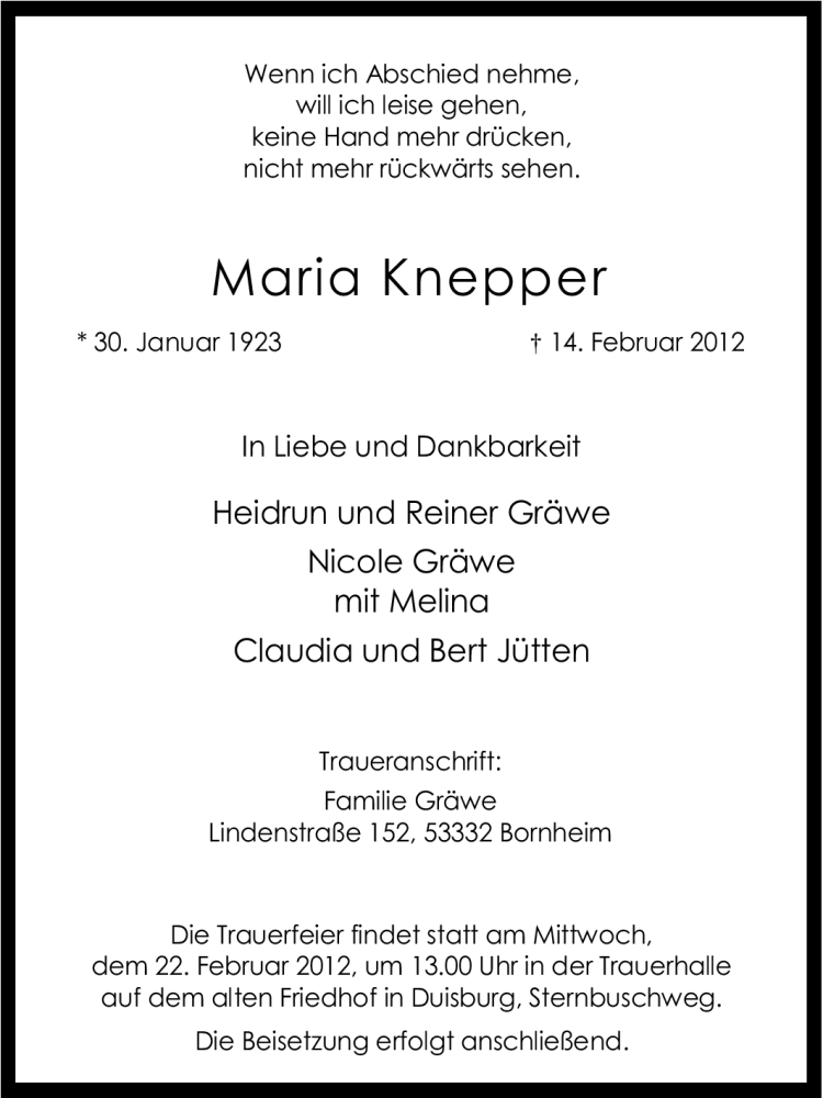 Hier finden Sie alle Traueranzeigen aus der Zeitung, die bisher für Maria Knepper erschienen sind. Weitere Traueranzeigen, die in der Zeitung erscheinen, werden hier ebenfalls aufgelistet