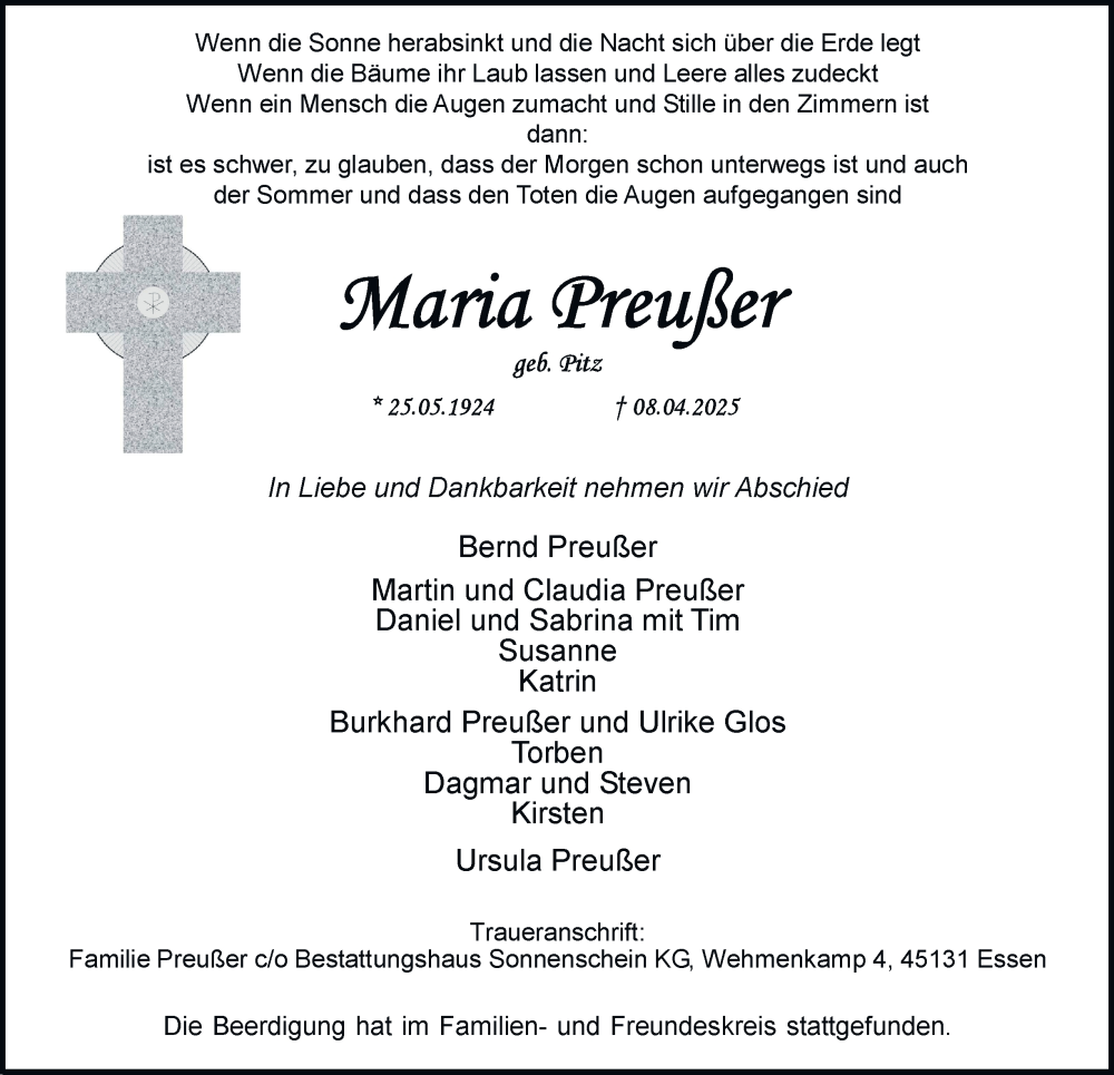 Hier finden Sie alle Traueranzeigen aus der Zeitung, die bisher für Maria Preußer erschienen sind. Weitere Traueranzeigen, die in der Zeitung erscheinen, werden hier ebenfalls aufgelistet