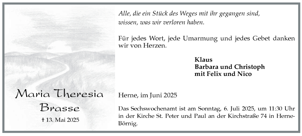 Hier finden Sie alle Traueranzeigen aus der Zeitung, die bisher für Maria Theresia Brasse erschienen sind. Weitere Traueranzeigen, die in der Zeitung erscheinen, werden hier ebenfalls aufgelistet